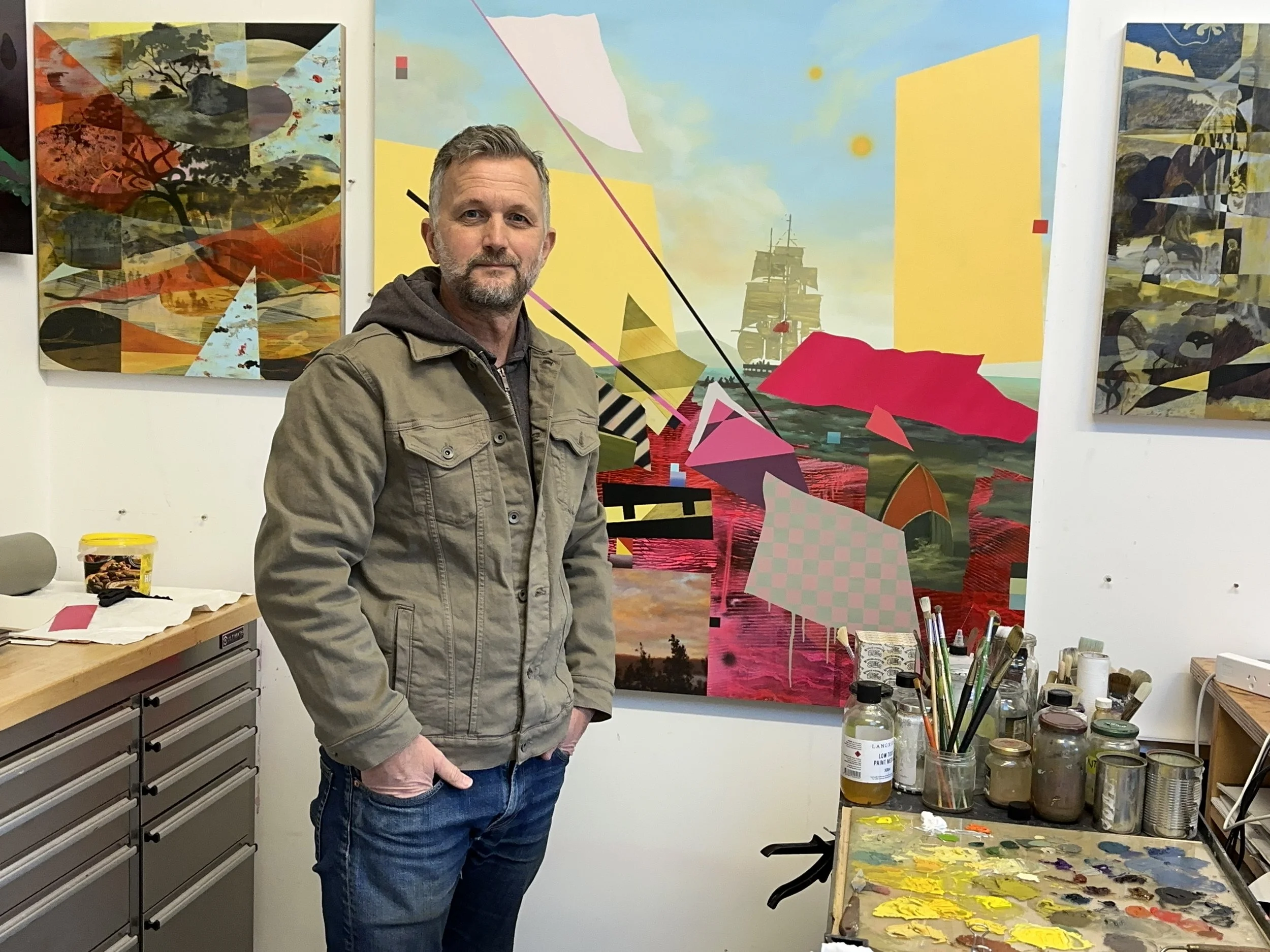 Neil Haddon is a British Australian artist based in lutruwita/Tasmania. His paintings explore displacement and identity through a migratory aesthetic. Exhibited at MONA, the National Gallery of Victoria, and the Tasmanian Museum and Art Gallery, his work is held in major Australian collections and has been exhibited globally.